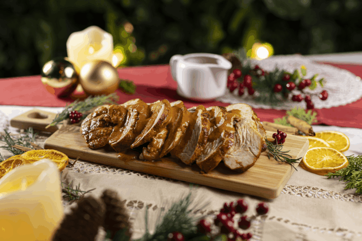 El menú incluye pechugas de pavo al horno con aderezo tradicional y salsa gravy, y panceta cocinada a baja temperatura, acompañada de una salsa oriental de la casa. Como guarniciones, se ofrecen dos ensaladas: Waldorf y una opción fresca con mix de lechugas, tomatitos cherry, láminas de kiuri y rabanito, frutos secos picados e hilos de zanahoria con vinagreta de la casa.